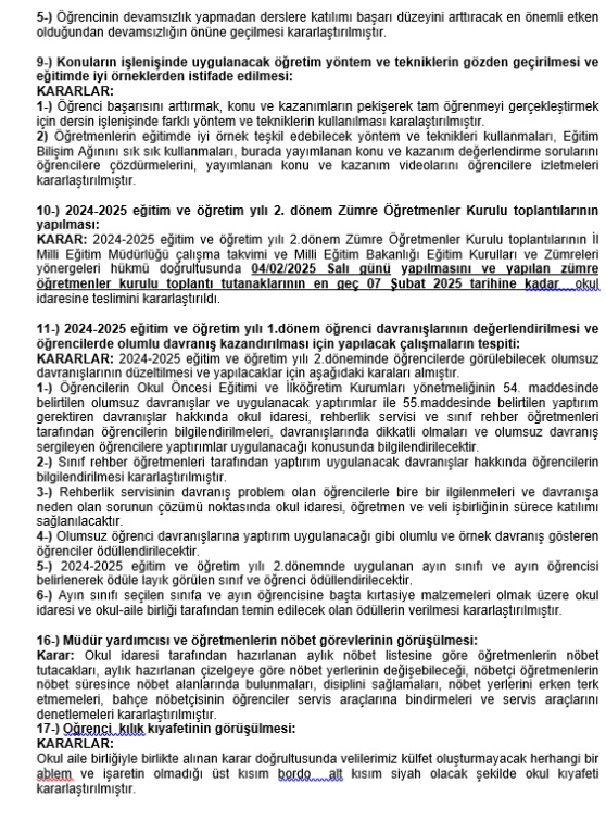 03/02/2025 tarihli Öğretmenler Kurulu toplantısı ve Okul Aile Birliği görüşmeleri sonucunda, okul kıyafetlerinde herhangi bir değişikliğe gidilmemesi yönünde karar alınmıştır.